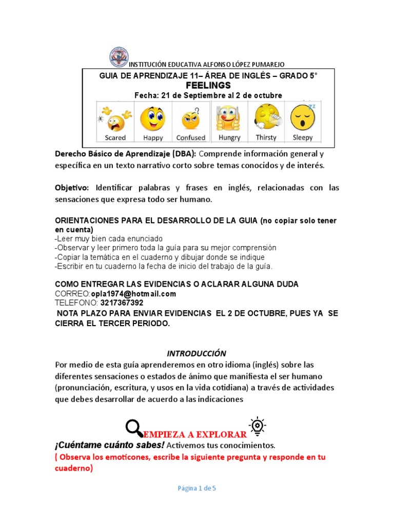 Guia 11 De Ingles 5ºc Feels Pdf Aprendizaje Idiomas